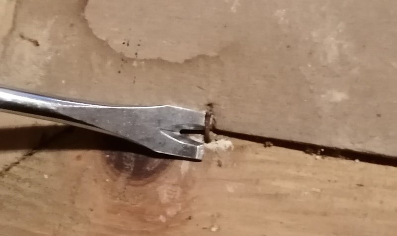 Pour les retirer, il suffit de vous munir d'un tournevis (pour ma part j'utilise un arrache clou de tapissier) , afin d'écarter les clous délicatement puis, avec une pince, de les ôter du bois. 👇